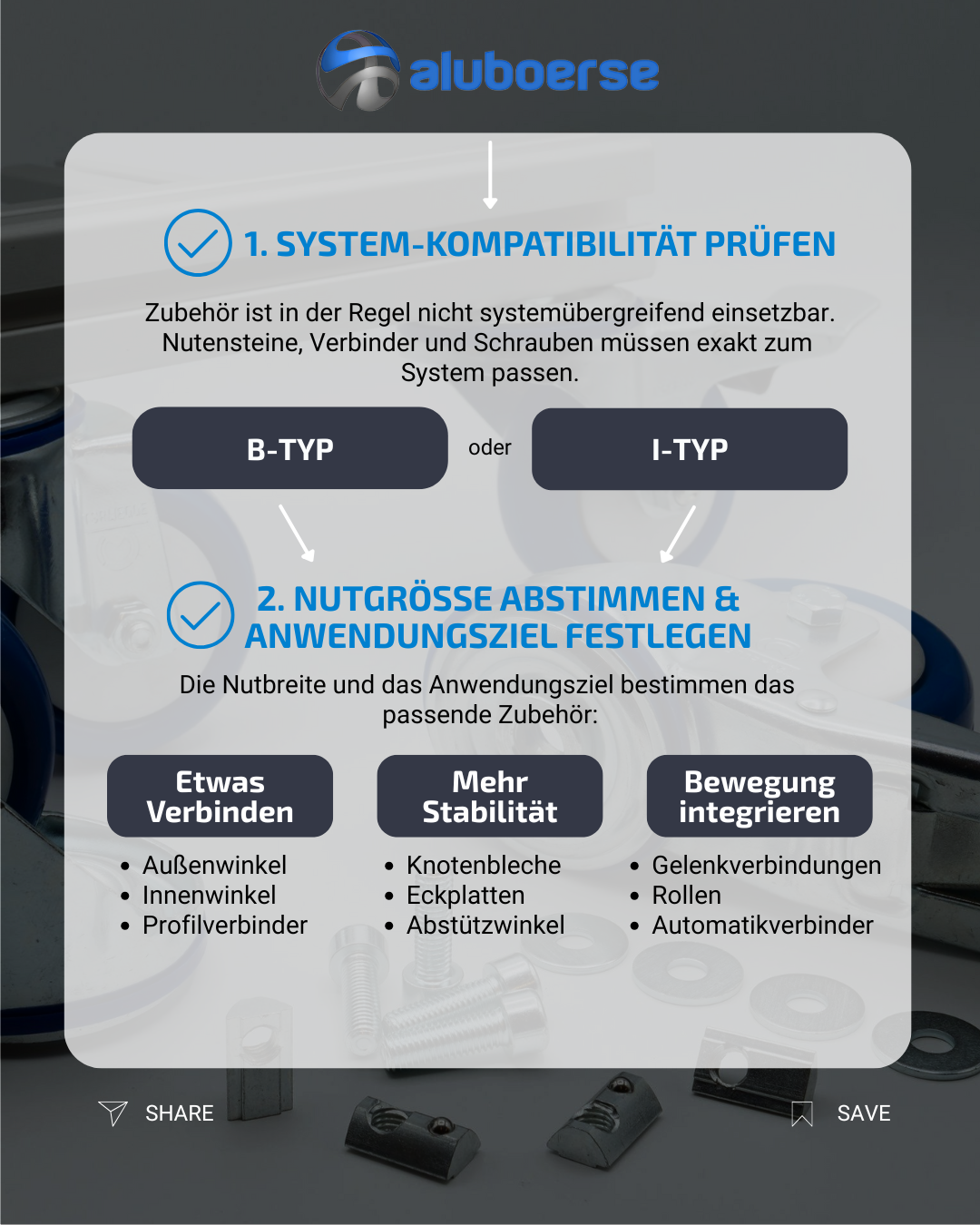 Ein weiterer Fehler besteht darin, Zubehör und Profile getrennt zu beschaffen. Wer etwa Nutensteine bereits besitzt, sollte beim Kauf neuer Profile unbedingt prüfen, zu welchem System diese gehören. Ebenso gilt: Wer ein neues Projekt beginnt, sollte sich frühzeitig auf ein System festlegen, um spätere Probleme zu vermeiden.