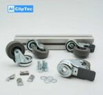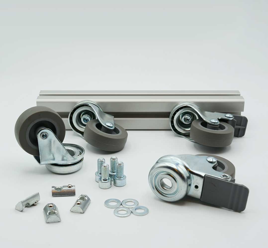2 Lenkrollen mit Feststellbremse, 2 Lenkrollen ohne Feststellbremse und 4 Zylinderschrauben, 4 Nutensteine und 4 Unterlegscheiben.